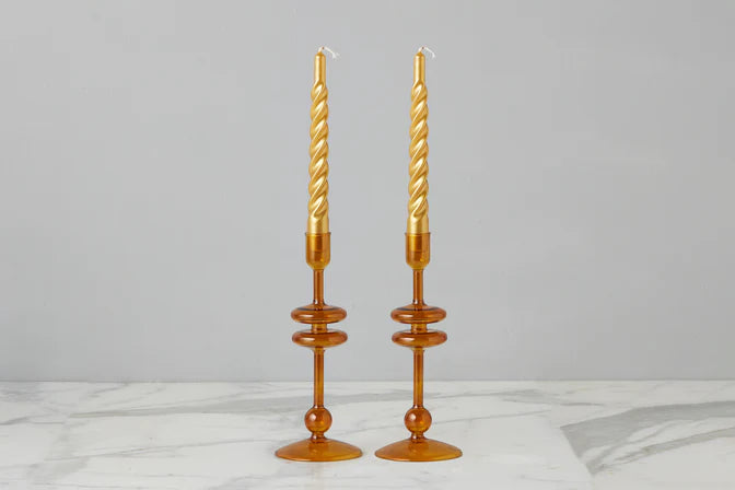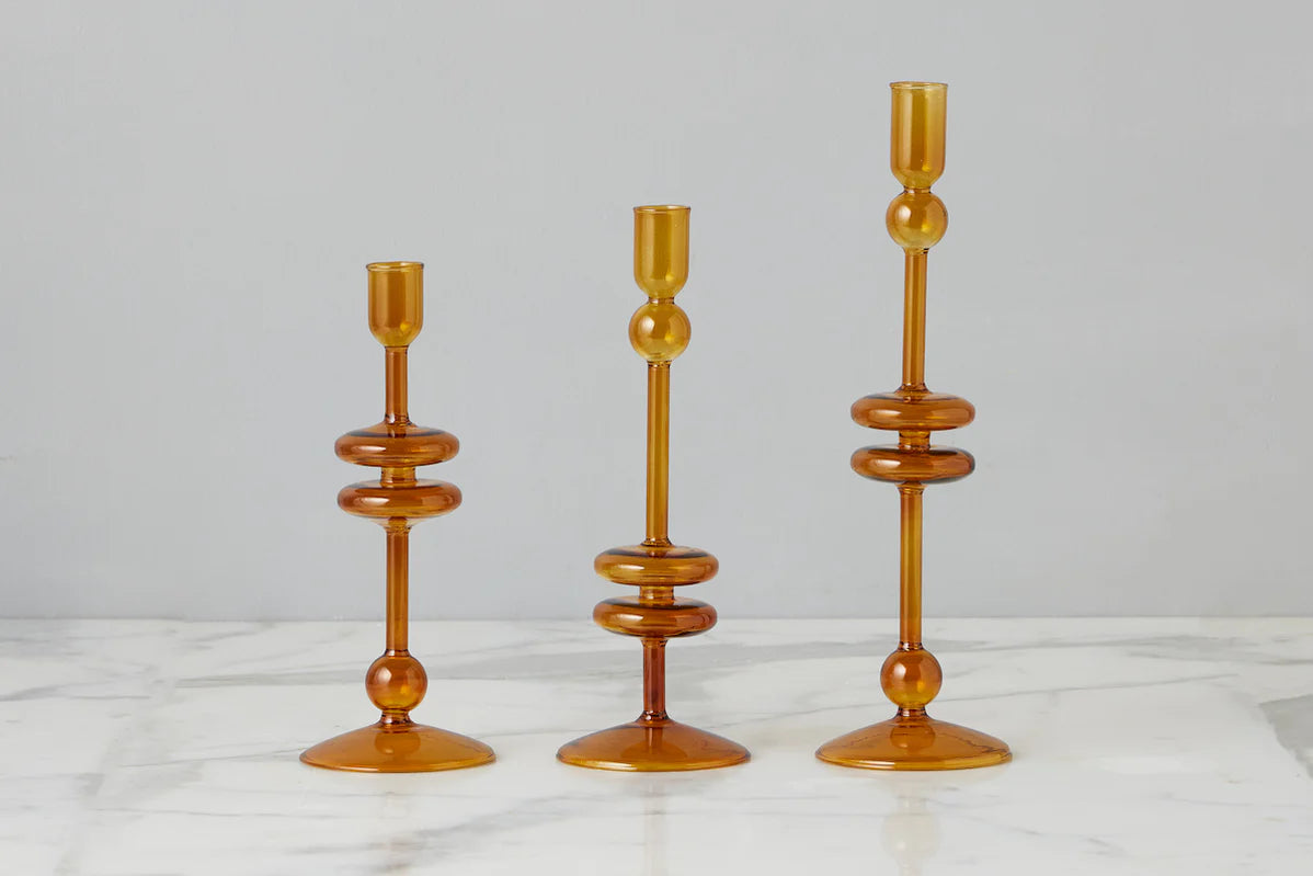 Elevate your home decor the Amber Glass Candlesticks. These expertly crafted taper candle holders add a touch of timeless elegance to any room. Available in three sizes and colors, they are perfect for adding a pop of color to your dinner party or creating a statement throughout your home. Mix and match the sizes and colors to create a memorable tablescape.