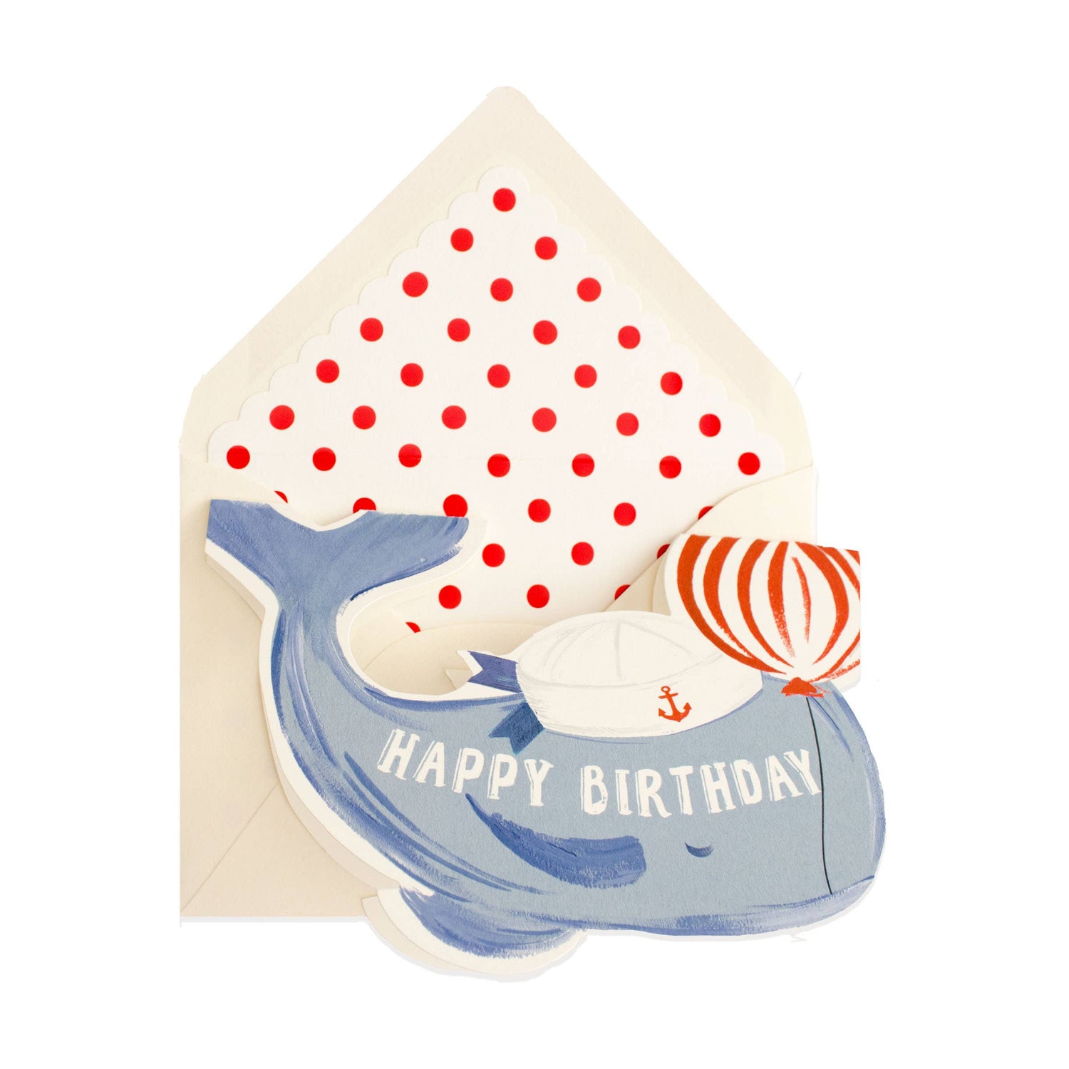 Happy Birthday Whale Card Die cut into whale shape Folded horizontally Fits in A7 Envelope Red dotted liner Cream Envelope Cello Sleeve ©The First Snow