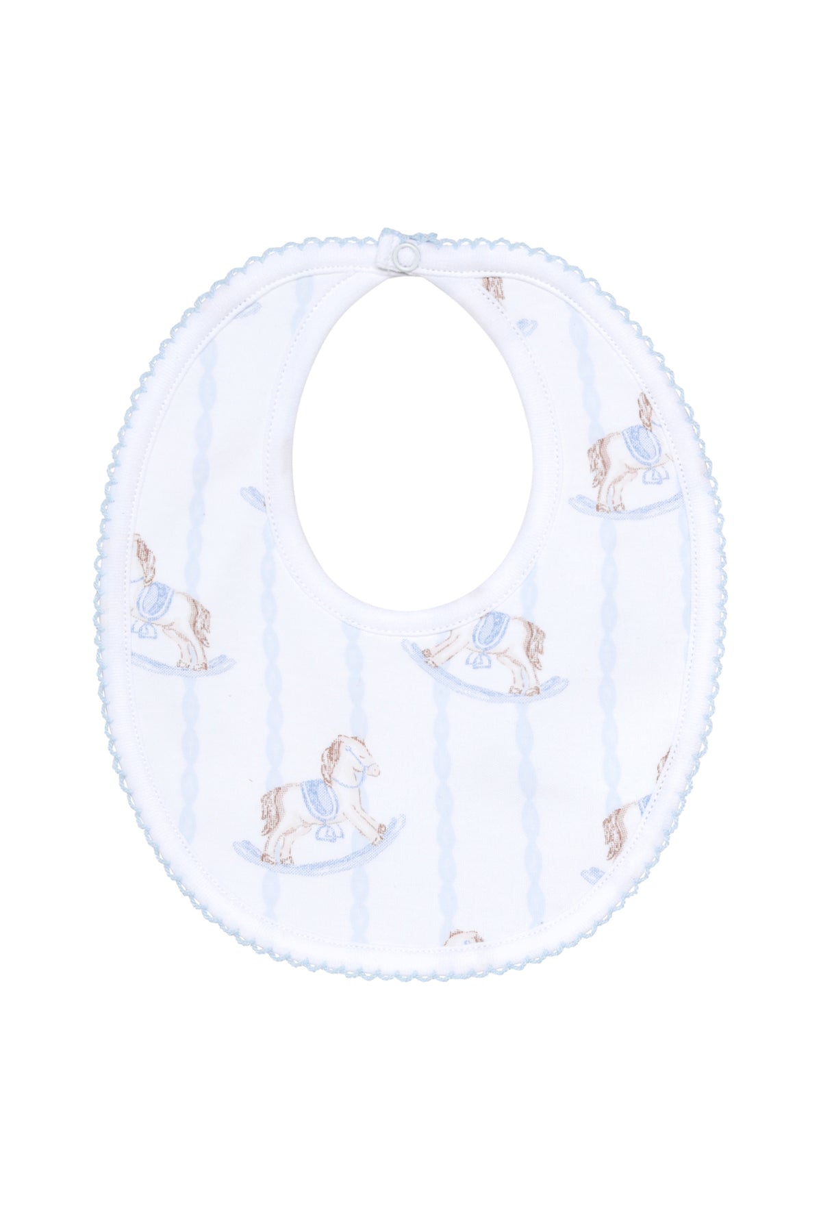 Blue picot trim detail and buttons located behind the bib for easy on-and-off
