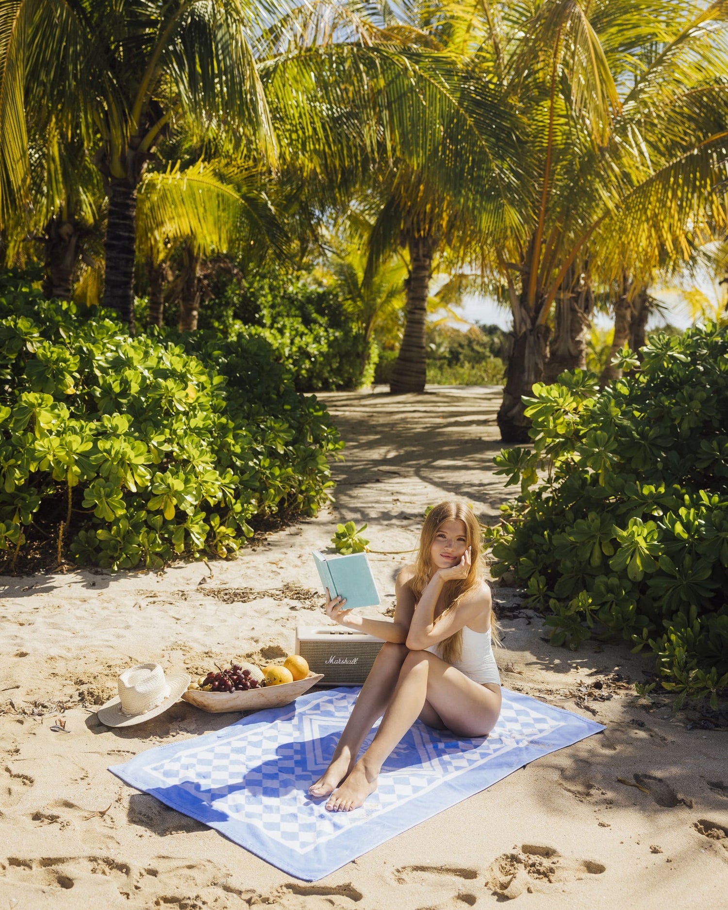 Enter paradise with our Blue Sol Beach Towel. 100% cotton for a cozy, plush & soft beach or pool day. Matches our Blue SolDual Chaise Pool Float. Two Way From sunrise to sunset - wrap yourself in our new best seller.