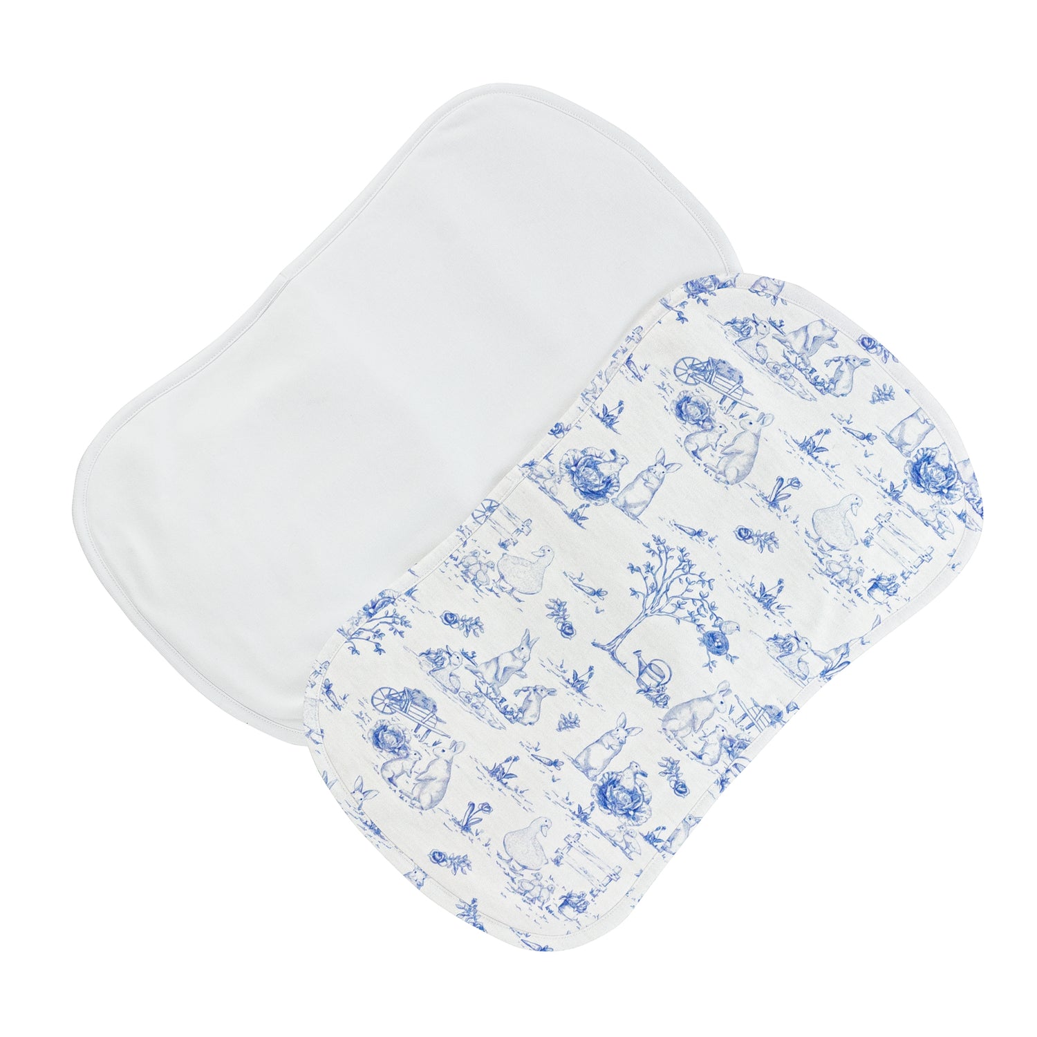 Includes one printed and one solid burp cloth