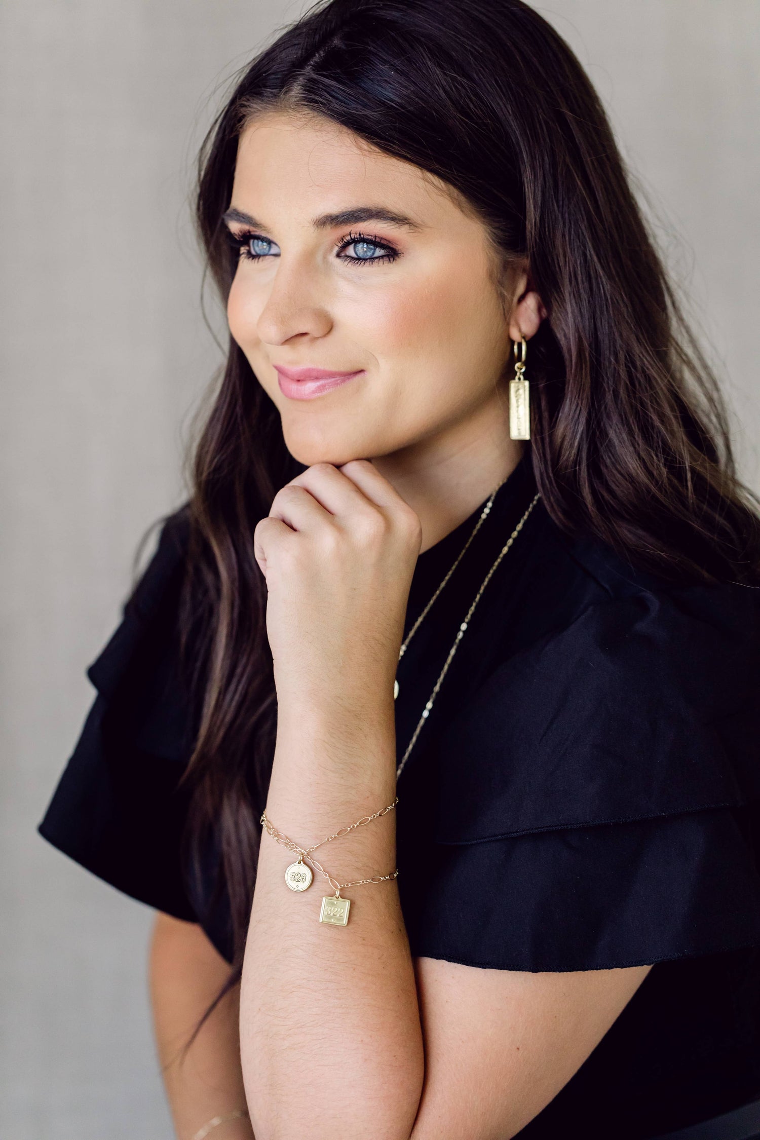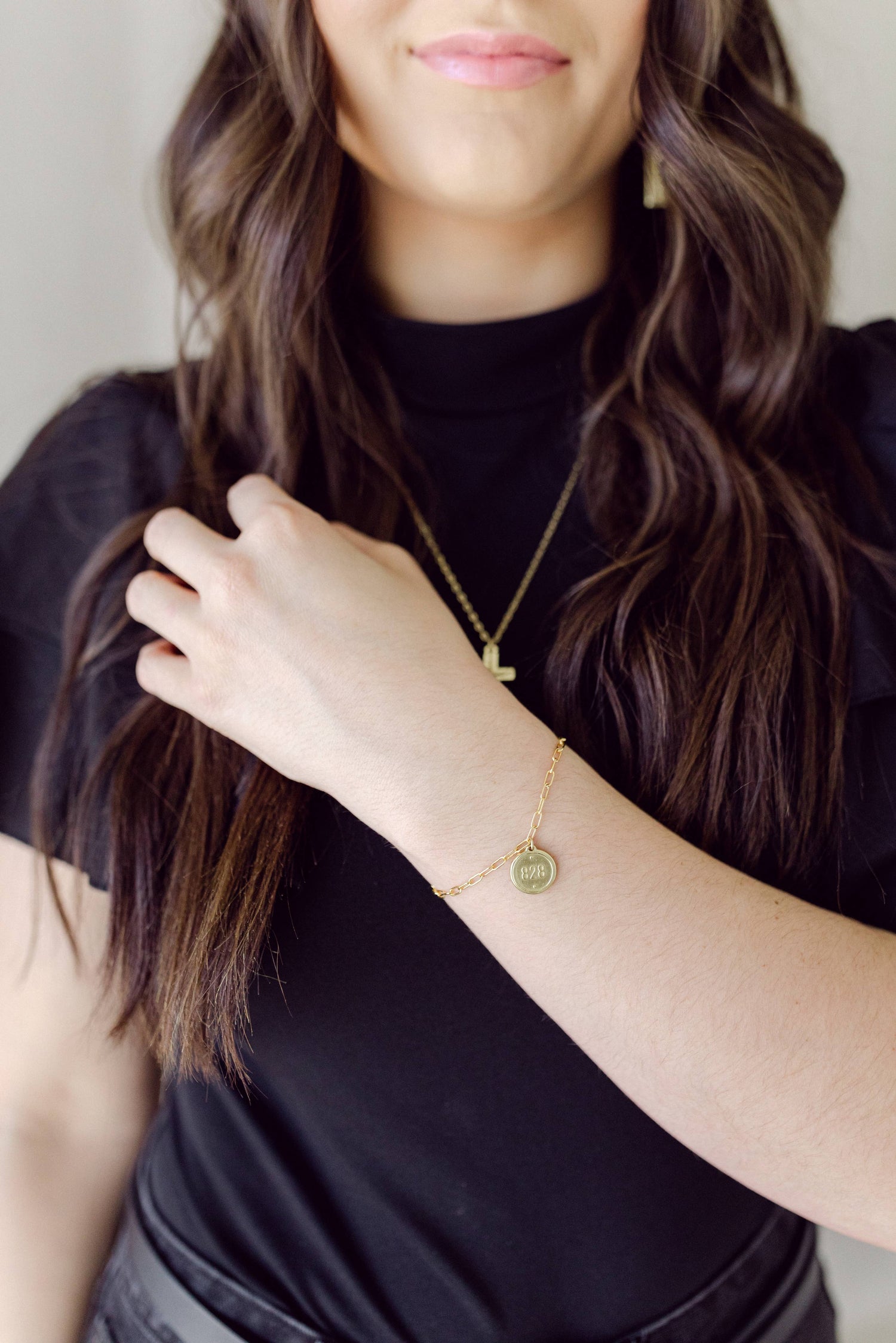 Pendant Verse - Romans 8:28 "And we know that in all things God works for the good of those who love Him, who have been called according to His purpose." Bracelet Details - - Gold filled chain - Bronze petite pendant - Lobster clasp closure - Bracelet length - 7.75 in - Adjustable length - Pendant size - 15 mm x 15 mm - Each bracelet includes a branded jewelry pouch and a verse tag that corresponds to the numbers on the pendant.