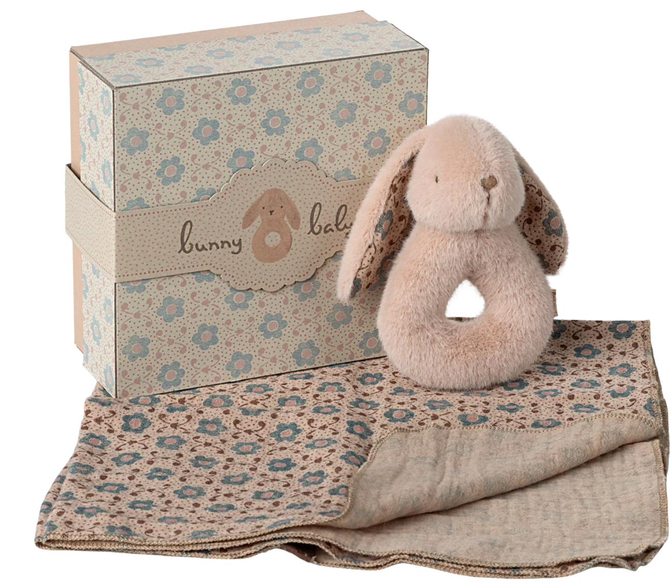 A perfect gift idea for the little ones. The set includes a soft cotton cloth and a small bunny rattle. The bunny has a small rattle inside that makes a soft sound. It all comes in a beautiful gift box.