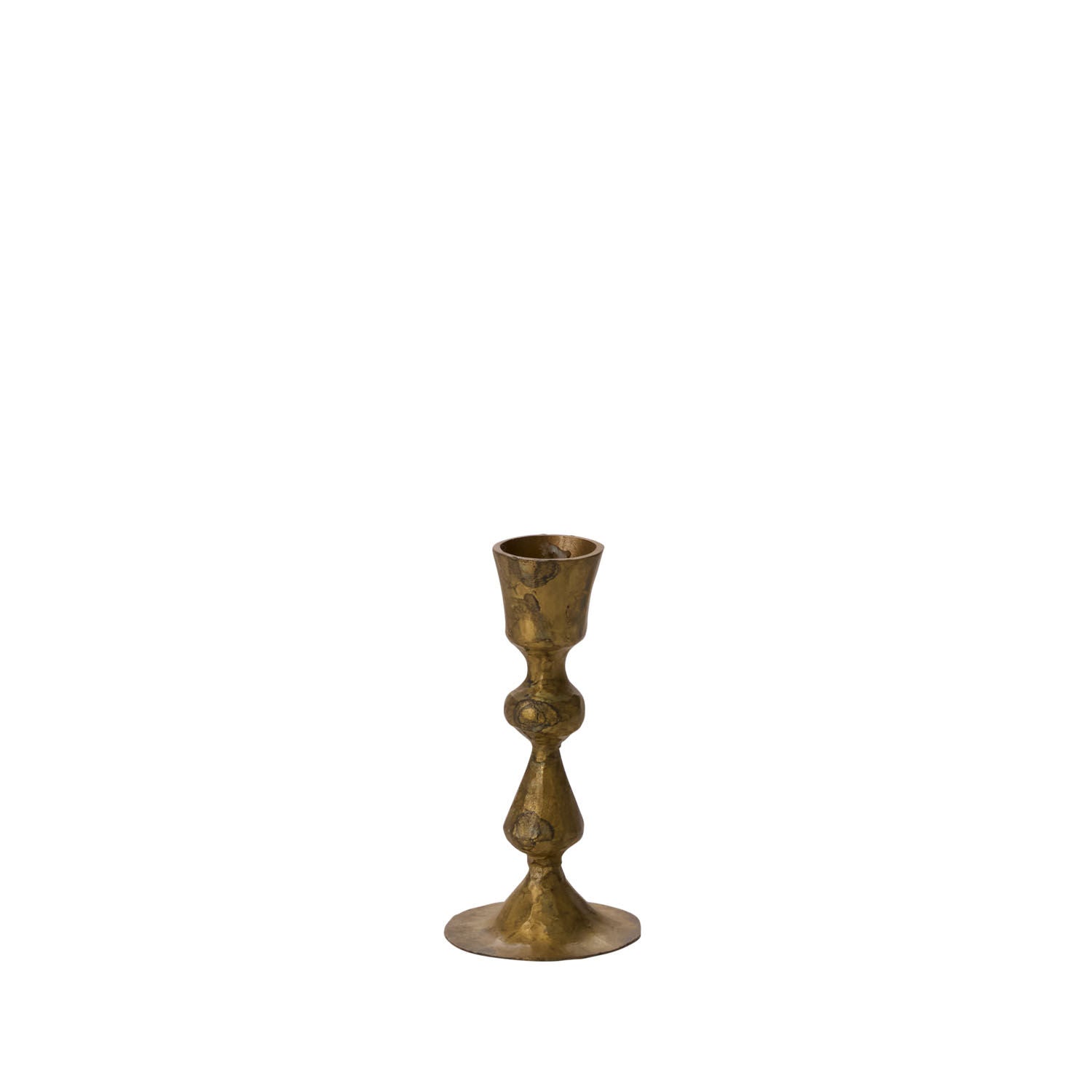 Like an artisanal found object, the curvy petite metal Clarion Candleholder brings an antique warmth to table settings. Made from hammered metal with an aged gold finish, this candleholder securely holds standard taper candles & can be paired with a 2.5-inch glass sleeve for an easy elegance. Simple & versatile with an artful texture & finish, the Clarion is perfect for everyday home or event decor & lovely layered with its other 2 sizes down a table.