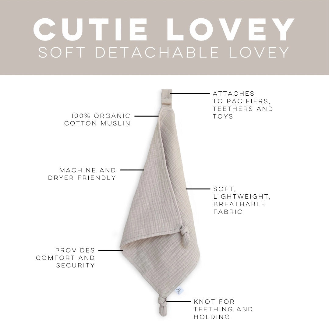 Our Cutie Loveys are perfect for providing comfort and security, while easily attaching to a pacifier, teether, or toy. They are soft, breathable, double layered, and are made out 100% organic muslin cotton. The Cutie Loveys come in two styles: knot and ruffle.