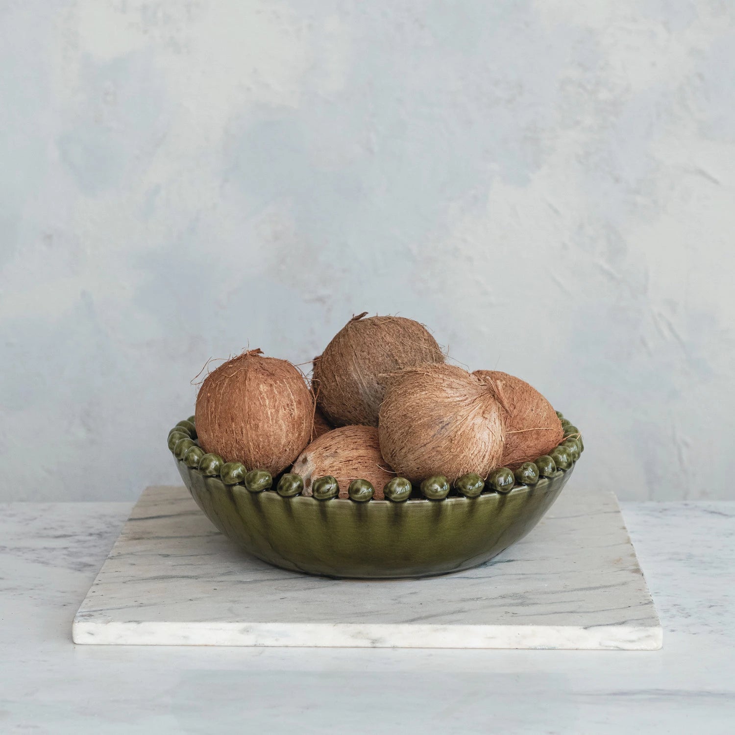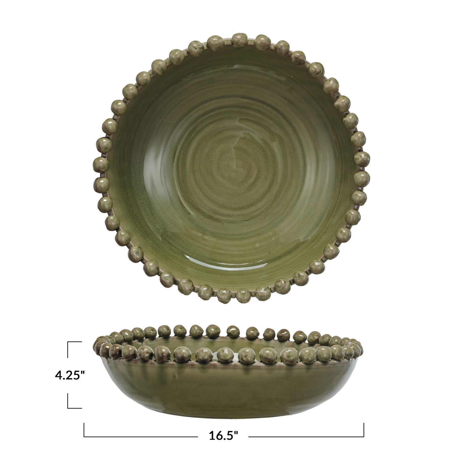 This Round Decorative Handmade Terra-cotta Bowl with Hobnail Edge is a versatile and striking addition to any home. The reactive glaze in green gives each bowl a one-of-a-kind look, ensuring that no two are exactly alike. It measures 16.5 inches in diameter and 4.25 inches in height, making it a statement piece for any room. While it's not designed to hold water, this bowl is perfect for displaying fruits, decorative balls, or simply as a stand-alone piece of art. Its generous size and distinctive style make it a focal point in any setting.