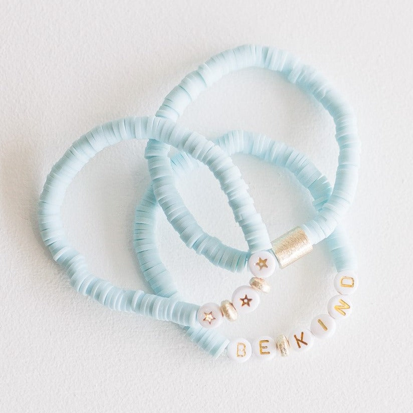 Darling pastel disk bracelets strung with gold details. Includes 3 bracelets. Be Kind is strung in white and gold beads, the other two bracelets have tiny gold beads as accents beads. Size 6.5 inches