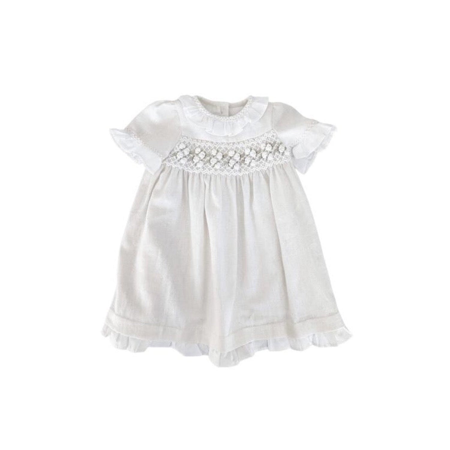 Our best selling Federica Baby Girl Dress. Made in traditional linen detail and signatured by Tecomoabesos is one to treasure forever. Emulating grace and playfulness, this dress comes complete with hand smocking, a delicate collar with off-white piping detail. Proudly made in Argentina.