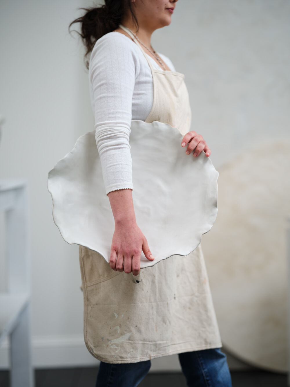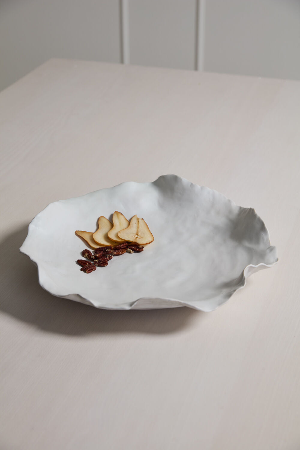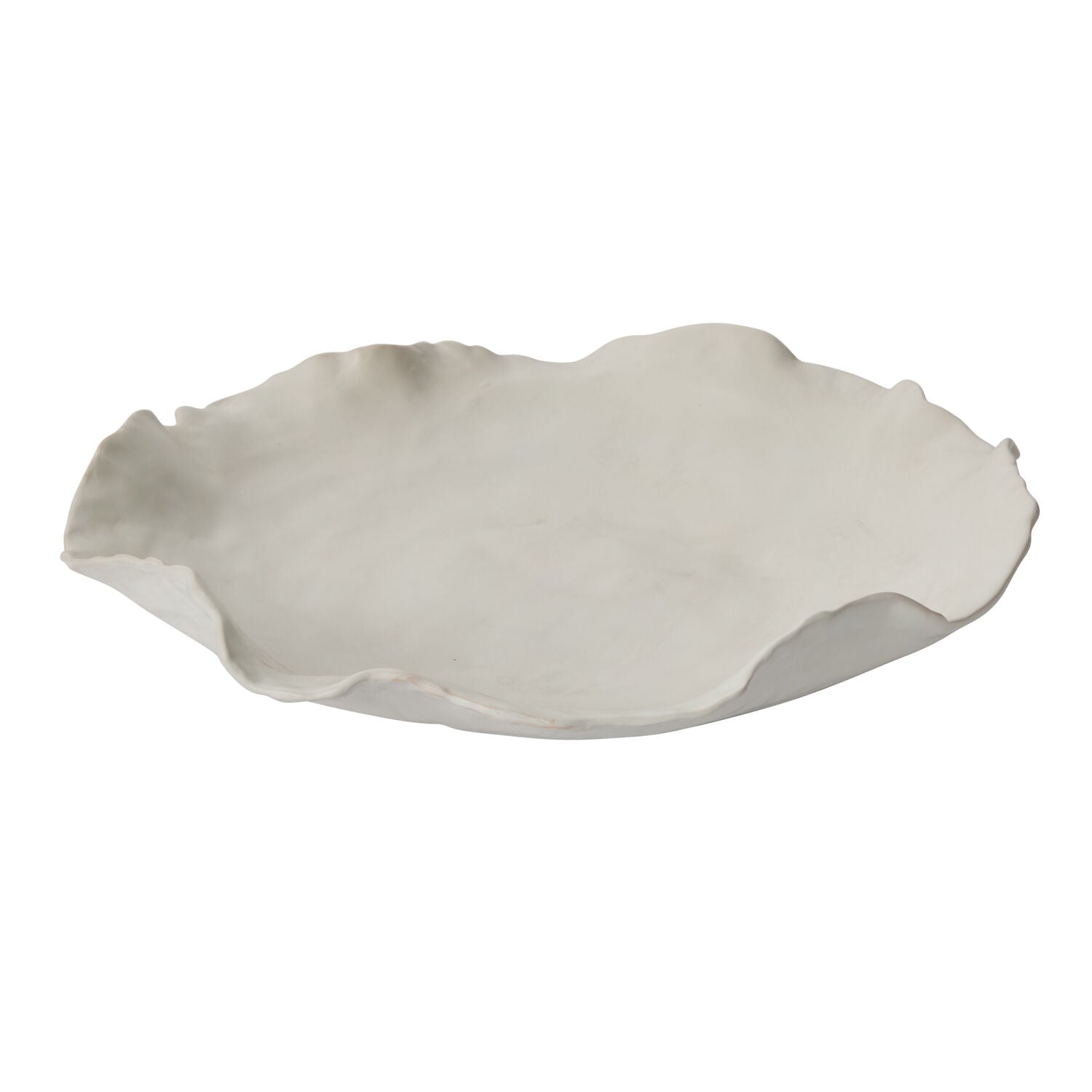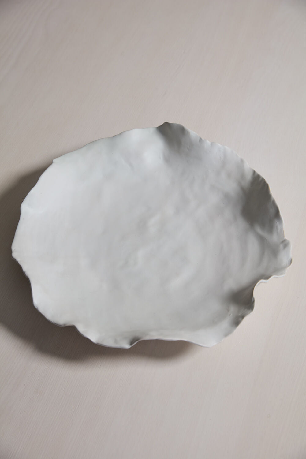 Minimalist & understated yet beautiful in its organic, artful look, the low, shallow Imagine Bowl creates impact in home decor with its large size but delicate appearance. Made from thin ceramic with a warm white matte finish, this piece with its irregular shaped rim is a stunning base for styling with bowl fillers or even serving food while bringing dimension & style to any surface.