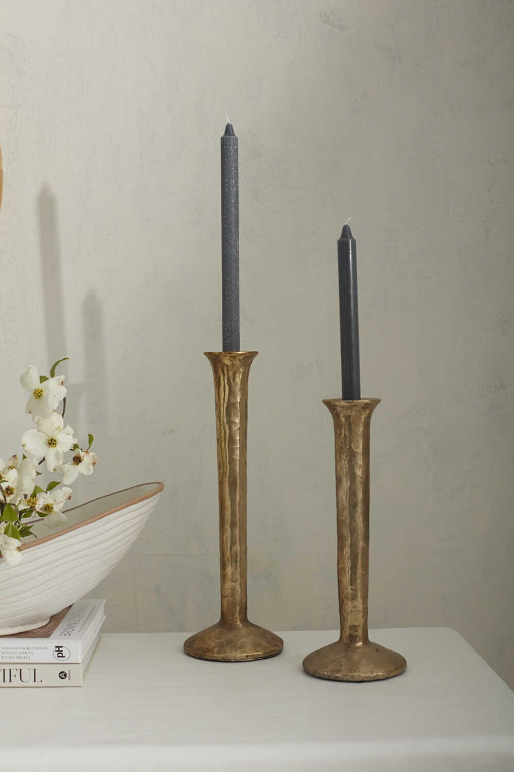 Take your table decor back in time. This spool-shaped metal candle holder is made from polyresin with a mottled gold finish, featuring surface variation for an aged, organic look. Add a taper candle for cozy vibes (small lip helps catch wax).