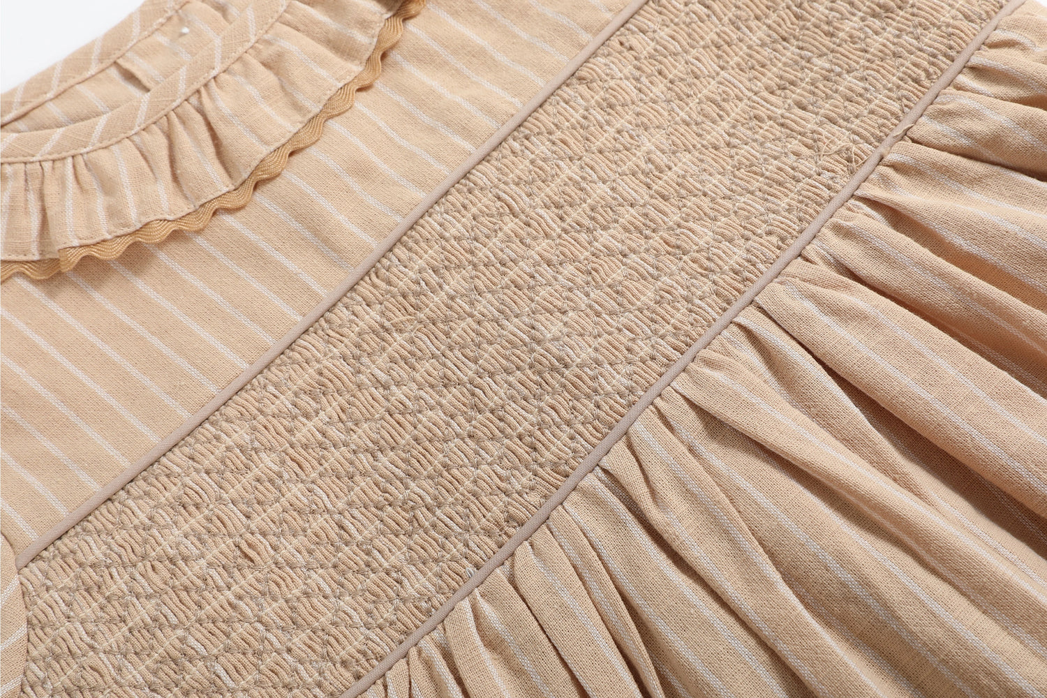 Let your sweet girl dress to impress in this Light Brown Smocked Ruffle Dress! The smocked chest adds classic detail, while the ruffle collar brings a whimsical touch to the design. A stylish tie-bow in the back enhances the charm and ensures the perfect fit. This dress is ideal for special occasions, family gatherings, or any event where she wants to shine.