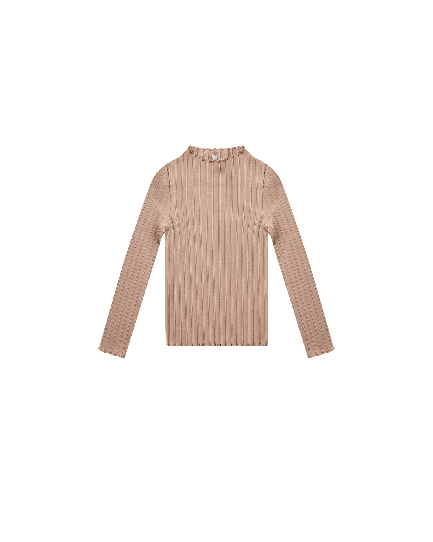 Fitted ribbed long sleeve tee with ruffle mock neck and ruffle sleeve openings and bottom opening.