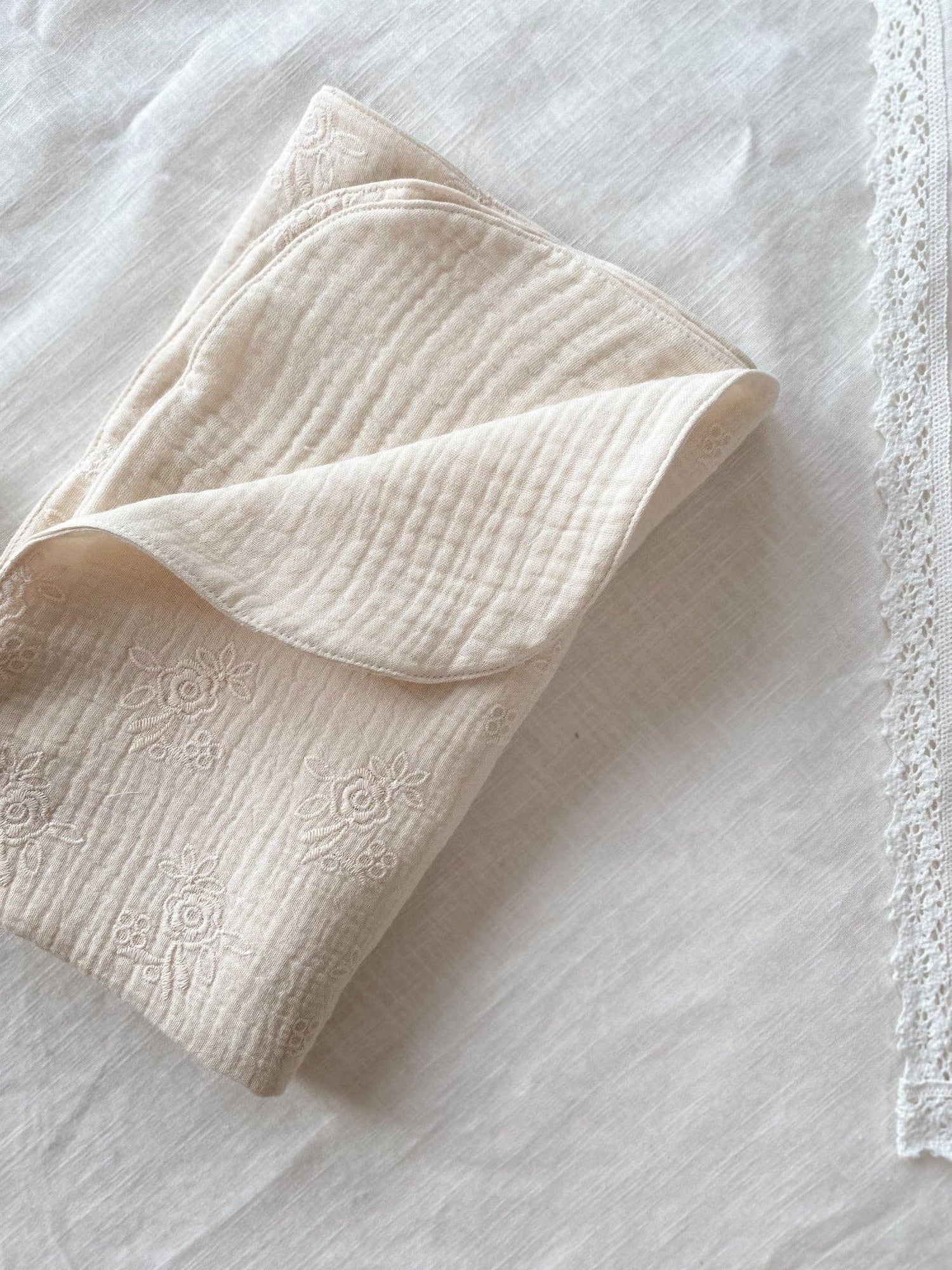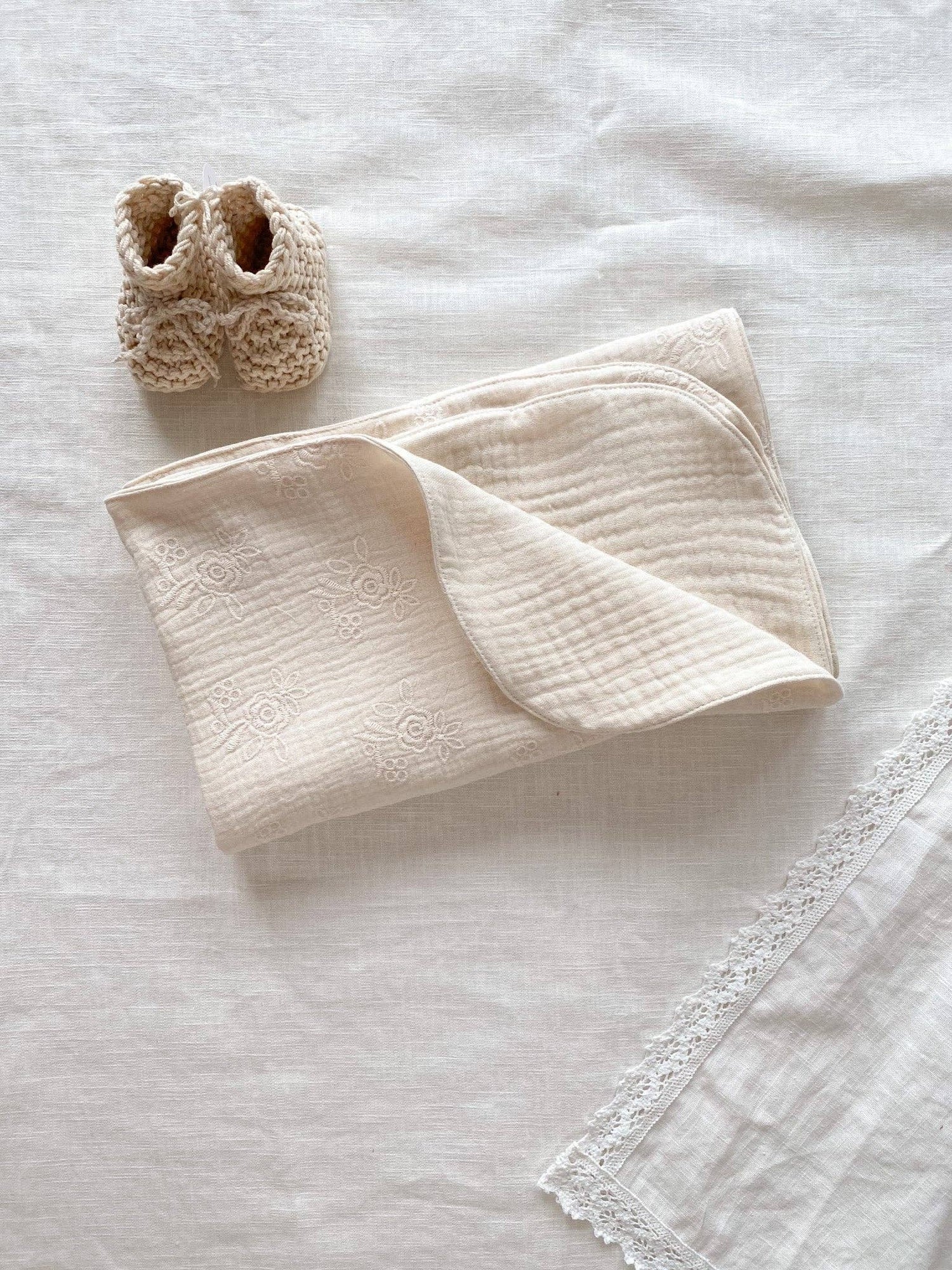 The blanket is made from double layer muslin on top and triple layer muslin on the bottom. Both Oekotex certified muslin. The blanket gets softer with each wash.