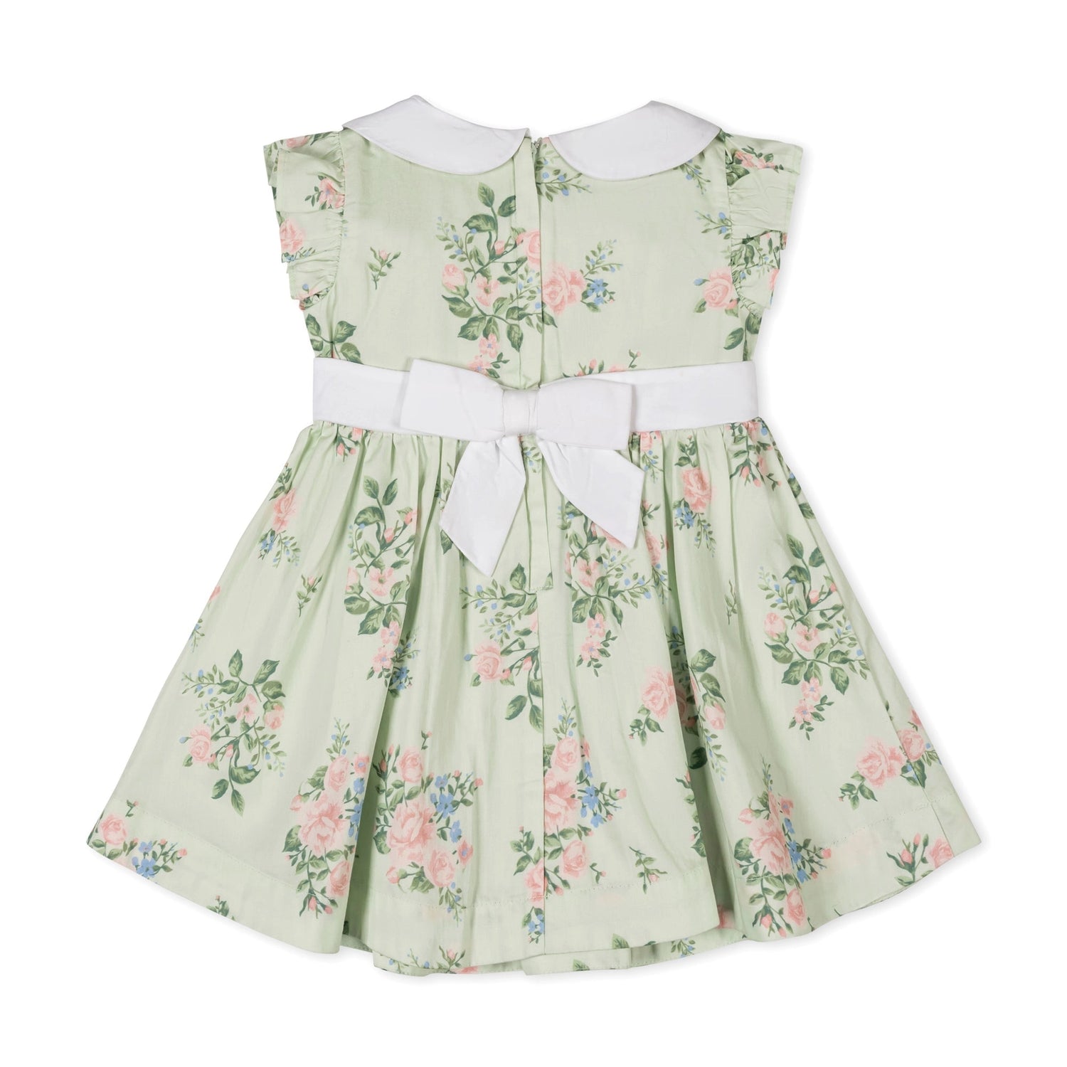 Our adorable dress in soft organic cotton sateen features an adorable peter pan collar to frame her face with simple charm. Features a woven collar, flutter sleeves, and a waist sash with bow at the center back. Zipper closure at center back. Comes with matching diaper cover. Ready for every picture perfect moment.