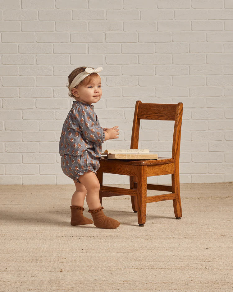 Quincy Set is a blousy long sleeve top with a matching bloomer sold as a set. The top is finished with a keyhole and light coconut button in the back.