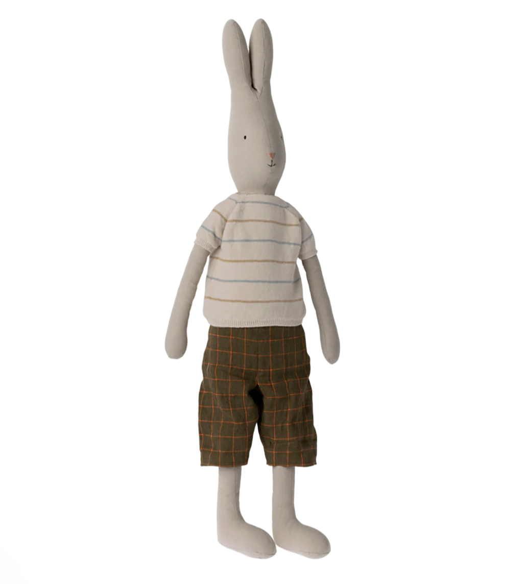 This classic size 5 rabbit is dressed for a fun day in his striped knit sweater and checked shorts. His tall ears and soft smile make him a delightful friend for cosy cuddles and gentle play, always ready to share in the day’s adventures. When the day grows quiet, he patiently sits as part of the room decor while he waits for the next story to begin.