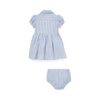 Puffed sleeves and a shirred waist give this striped oxford shirtdress a party-perfect look.