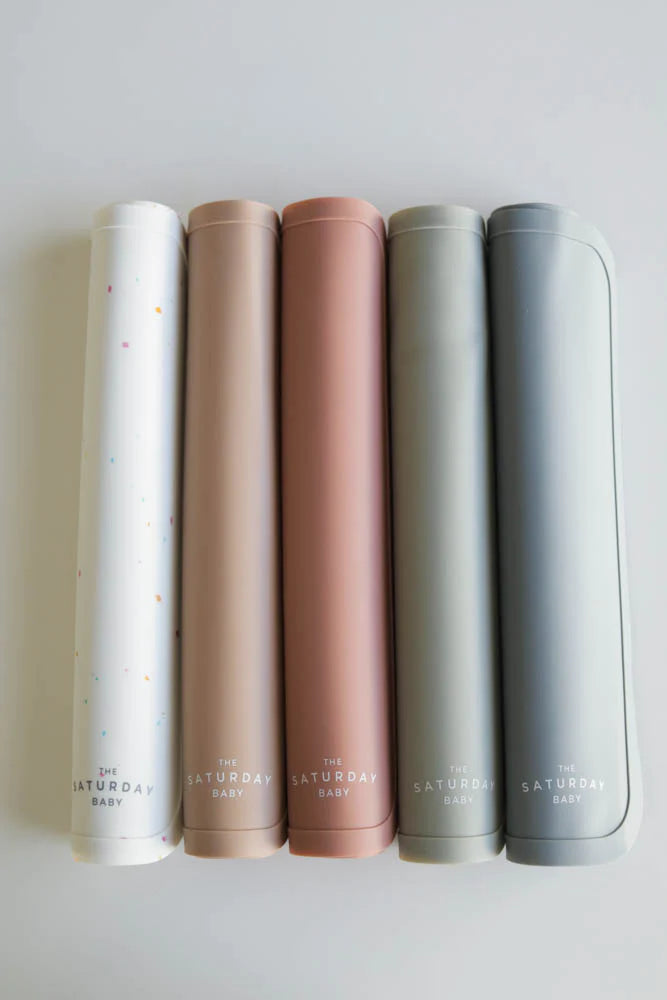 Our Saturday Baby placemats are made out of 100% food grade silicone material. Put our placemats in the dishwasher at home or conveniently wipe them off on the go. The placemat is perfect for meal time, snacks, playtime, or crafts. The placemat features a non slip back to help your placemat stay put. The rim around the edge keeps any spills at bay. Of course you can always feel safe knowing that all of our products are FDA approved, BPA, PVC, and BPS free.