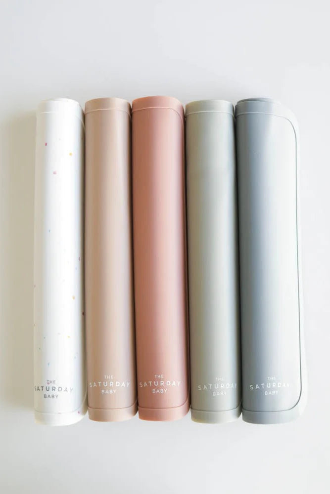Our Saturday Baby placemats are made out of 100% food grade silicone material. Put our placemats in the dishwasher at home or conveniently wipe them off on the go. The placemat is perfect for meal time, snacks, playtime, or crafts. The placemat features a non slip back to help your placemat stay put. The rim around the edge keeps any spills at bay. Of course you can always feel safe knowing that all of our products are FDA approved, BPA, PVC, and BPS free.