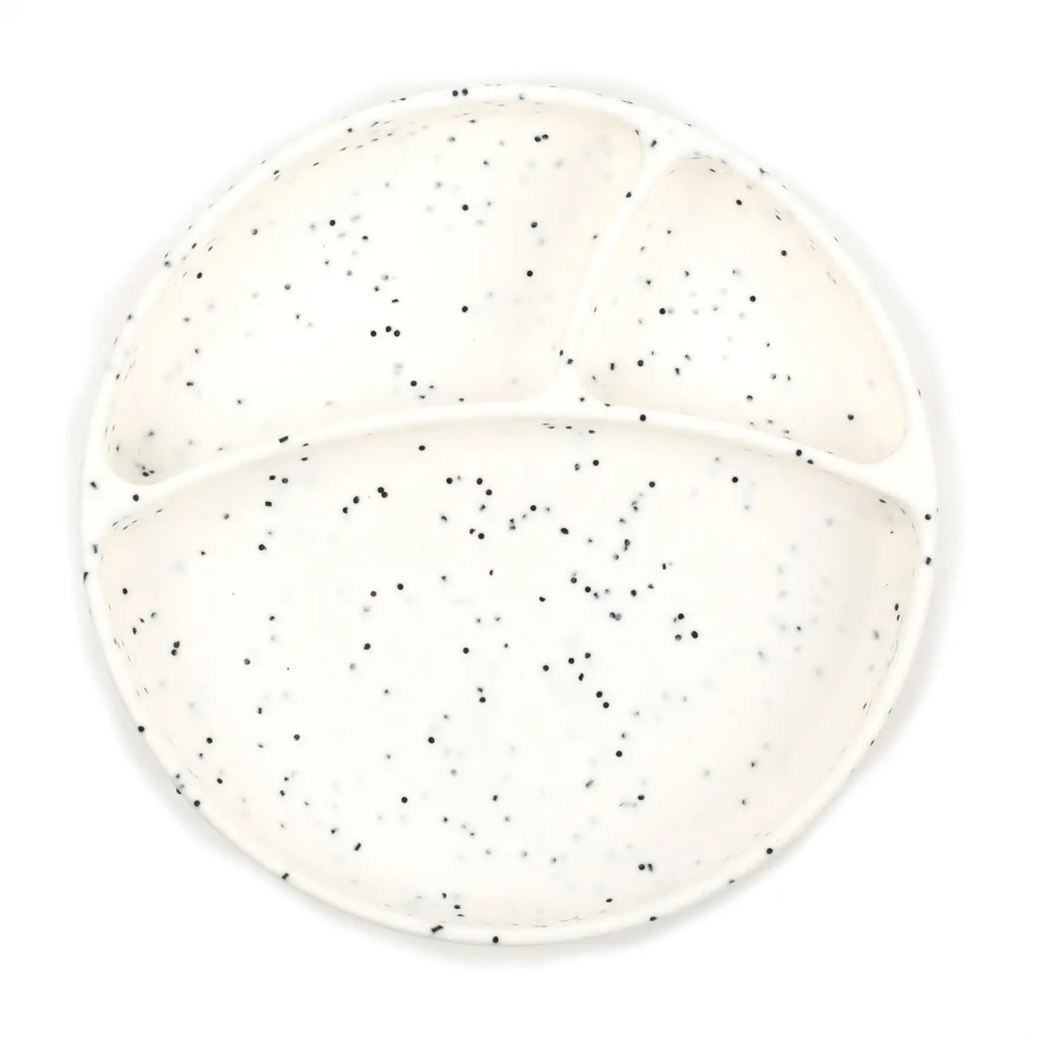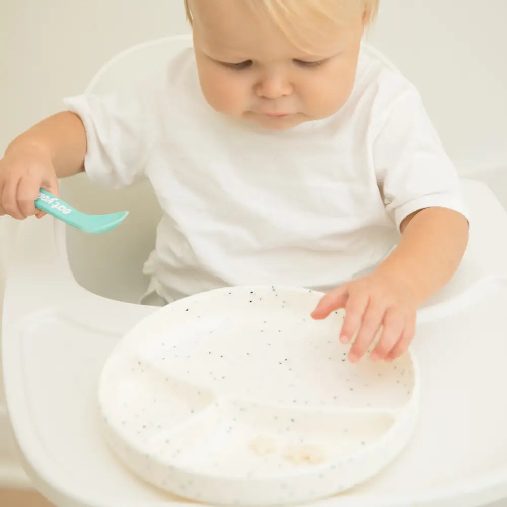 Super suction base with three sections that promote a well-balanced meal. The plate suctions to any table or highchair tray to keep meals in place. -