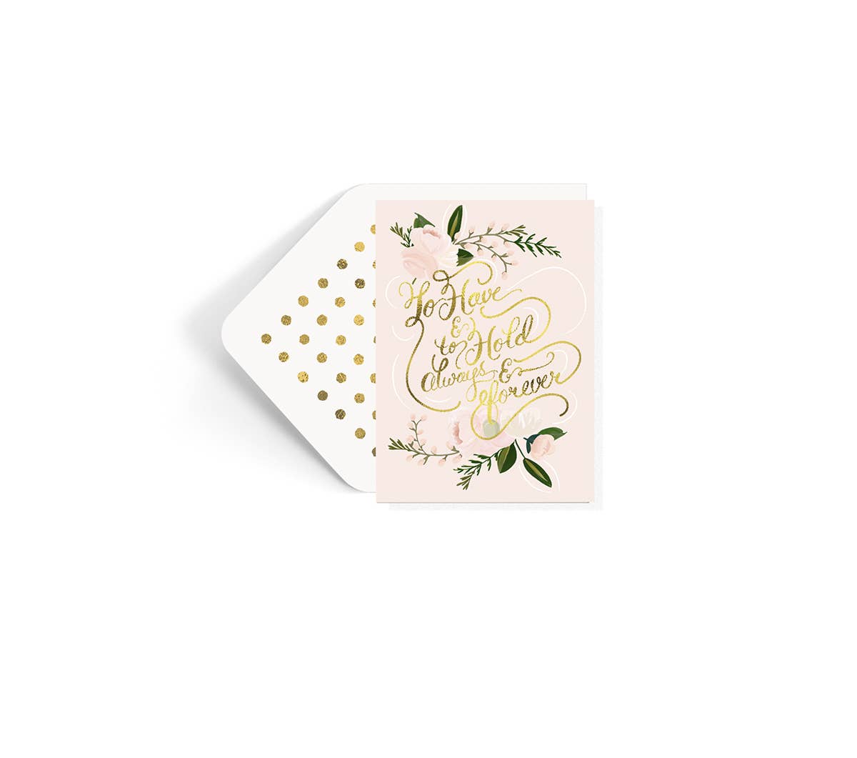 To Have and To Hold Always and Forever Wedding Card Gold foil, handwritten script Blush background, soft floral palette 5 x 7 A7 Card, Blank inside Folded Cream envelope Cream dotted liner Cello Sleeved ©The First Snow