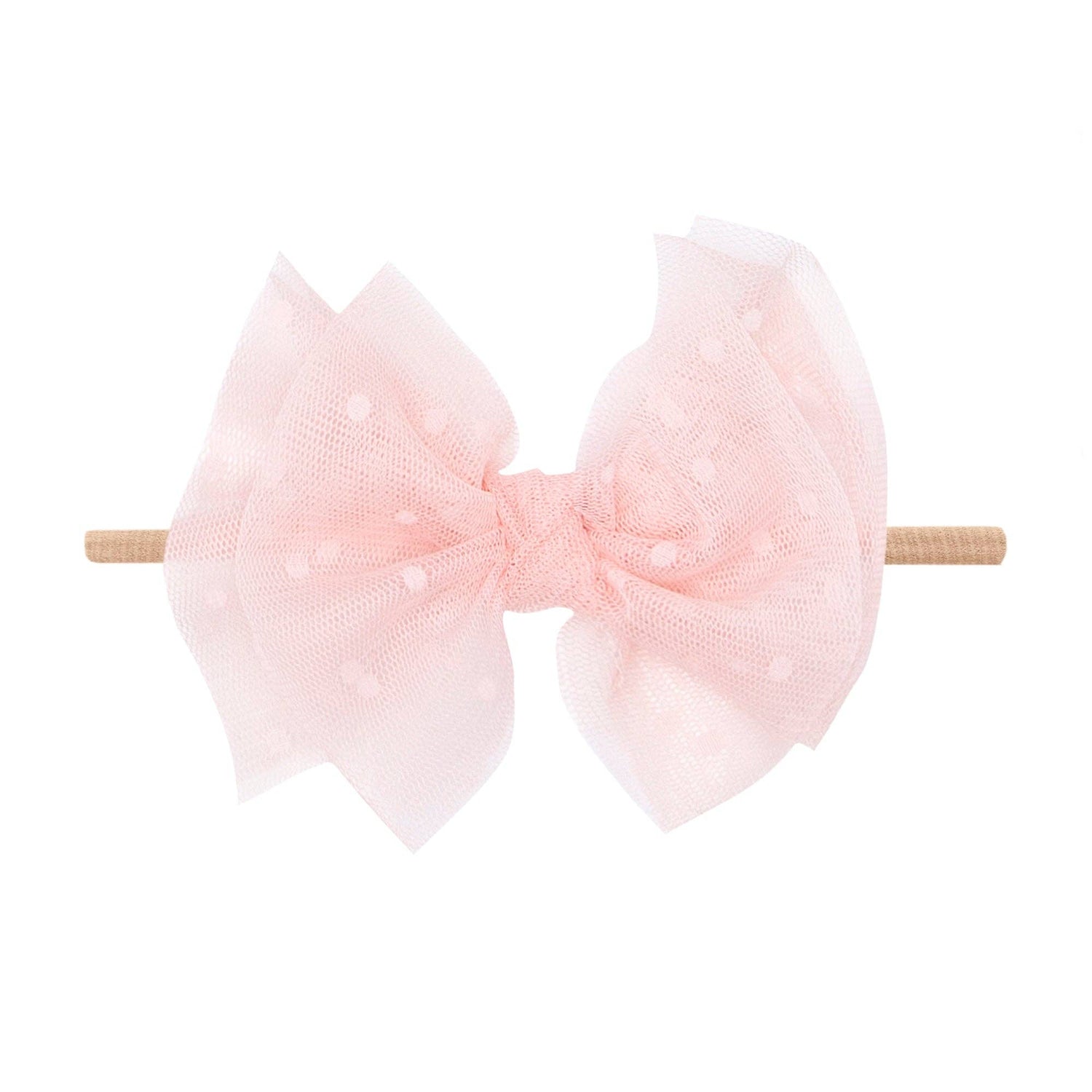 The Tulle FAB Skinny Headband - Perfect for weddings & other special occasions! We are believers that bigger is better, and we think the Tulle FAB SKINNY will convince you, too! This headband is one size fits most and the size cannot be adjusted. The tulle bow measures approximately 4.5" across. The FAB SKINNY headband is made from our soft, signature skinny nylon. All edges of this style are raw. This style is secured with adhesive once tied and is not meant to be untied. The tulle material is a soft polyester blend . Each headband is hand sewn and tied by women in our local community. Due to the nature of small-batch production color and sizing can vary slightly.