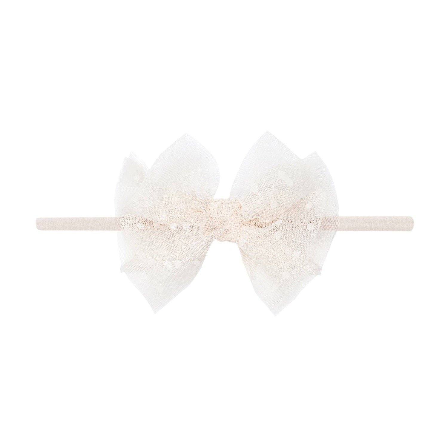 This LIL FAB® is the perfect size to keep their sweet face the focus. Soft textures, on-trend colors, and an understated size make this style the perfect first bow for every little one. DETAILS: * Skinny nylon headbands in shades to blend with skin or hair color. * No headband seams means maximum stretch for ultimate comfort. * Soft, rolled edges makes this bow casual enough for everyday wear. * Delicate tulle bow makes your tiny dancer the star of the show. * This style is secured with adhesive to ensure a picture perfect bow every time you put it on. * Each headband is hand sewn and tied by women in our local community. SIZING: * This headband is one size fits most and the size cannot be adjusted. * Stretches to fit up to a 32" head circumference * The headband measures .25” in width * The bow measures approximately 4" across. CONTENT: * Premium nylon/spandex blend skinny headband * Top quality, soft polyester tulle