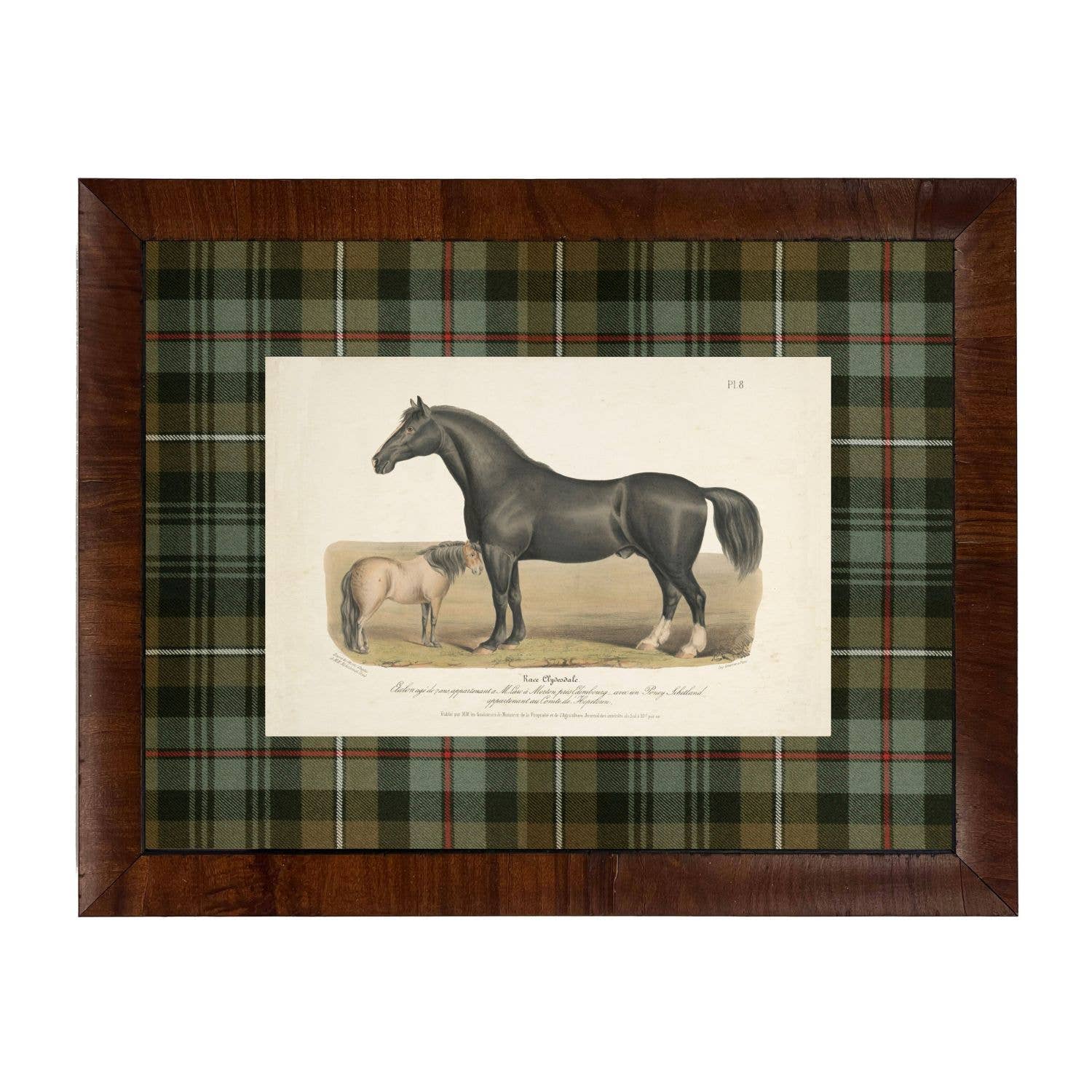 Vintage horse bookplate F matted in green and brown tartan under glass in a wooden frame.