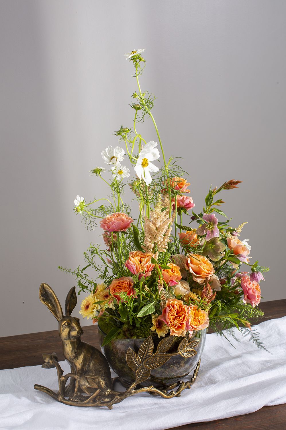 The Watership Centerpiece features an antique gold cast aluminum hare perched on a leafy branch. The curved branches hold a large glass bowl that, perfect for styling a wildflower arrangement as an Easter tabletop centerpiece.